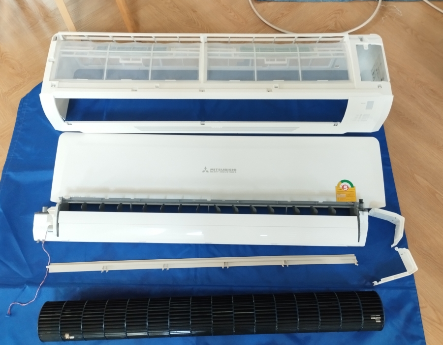 การล้าง: ถอดชิ้นส่วนแอร์ออกมาเป็นชิ้นๆ เพื่อนำไปแช่น้ำยาล้างคอยล์ และฉีดน้ำแรงดันสูงทำความสะอาดทุกส่วน.